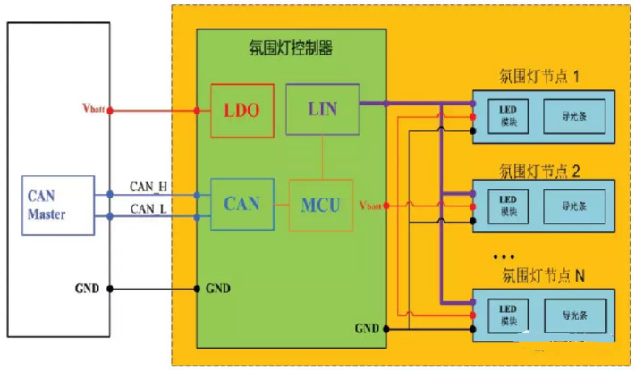 对车内各区域氛围灯的颜色进行全色彩全亮度的统一选择,亮度随时间变化,速度可调