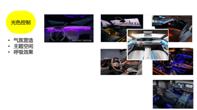 动态流水 控制氛围灯从车辆前部往后进行设定颜色的运动效果,速度可调,速度最慢2s,最快200ms 多色呼吸模式 对车的各区域的氛围灯进行全色彩范围和全亮度的独立设定。亮度随时间变化。速度可调 单色呼吸模式 对车内各区域氛围灯的颜色进行全色彩全亮度的统一选择,亮度随时间变化,速度可调 关联交互 行驶过程中让用户在舒适、运动等不同驾驶模式下提升情感化体验;同时,超速时,也会有危险灯光闪烁提示 音乐律动 与车内多媒体播放的时候联动,随音乐节奏和频率变化,氛围灯的颜色和亮度随之动感变化
