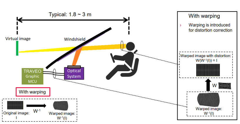 单芯片HUD解决方案,主要功能如下: 本地图像显示:仪表信息(车速、挡位、报警图标等)ADAS信息、导航信息和动态拟真道路指引等。 外部视频输入:实现AR-HUD效果,支持本地信息叠加显示。样机中实景和箭头来自视频输入,状态信息来自本地叠加。 硬件畸变矫正(warping)。